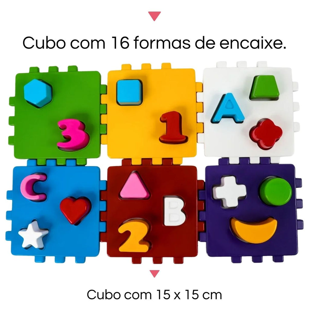 1 Cubo Didático (14 × 14 × 14 cm) que vira tapete com 16 formas para encaixar
